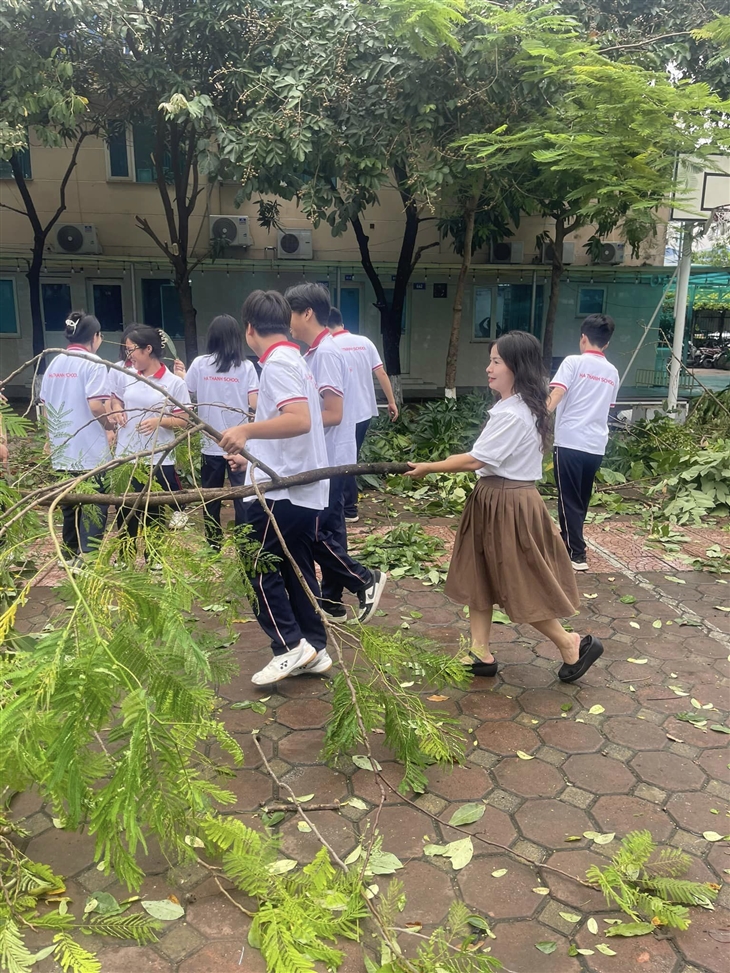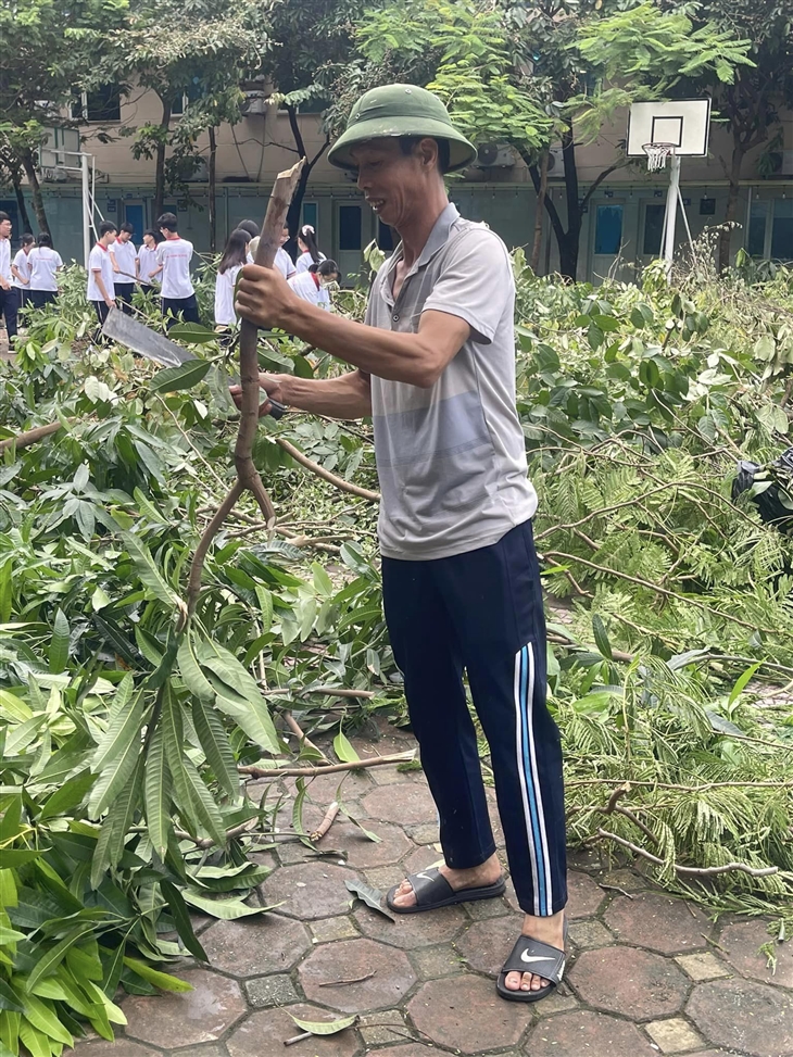 Với những cành cây đổ từ địa bàn lân cận và các tán cây gió cuốn đến, đã được các bác cán bộ nhân viên, các thầy cô gấp rút dọn dẹp, khắc phục hậu quả sau bão. Những giây phút nghỉ tay vội vã rồi lại tiếp tục công việc để sớm trả lại cảnh quan cho trường trước ngày học mới (09/09)