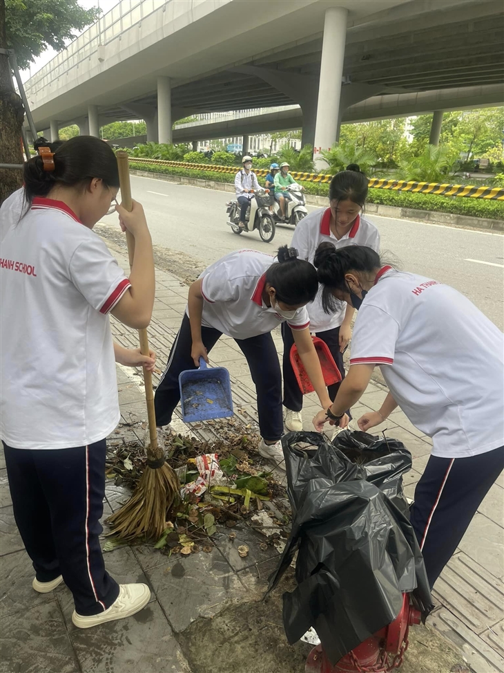 Tạo điều kiện cho các con học sinh trải nghiệm giúp đỡ các bác, các con Hà Thành đã rất hào hứng, thích thú tham gia nhặt gọn các cành cây, quét lá và nhặt vào túi bóng, tạo cảnh quan sạch đẹp.