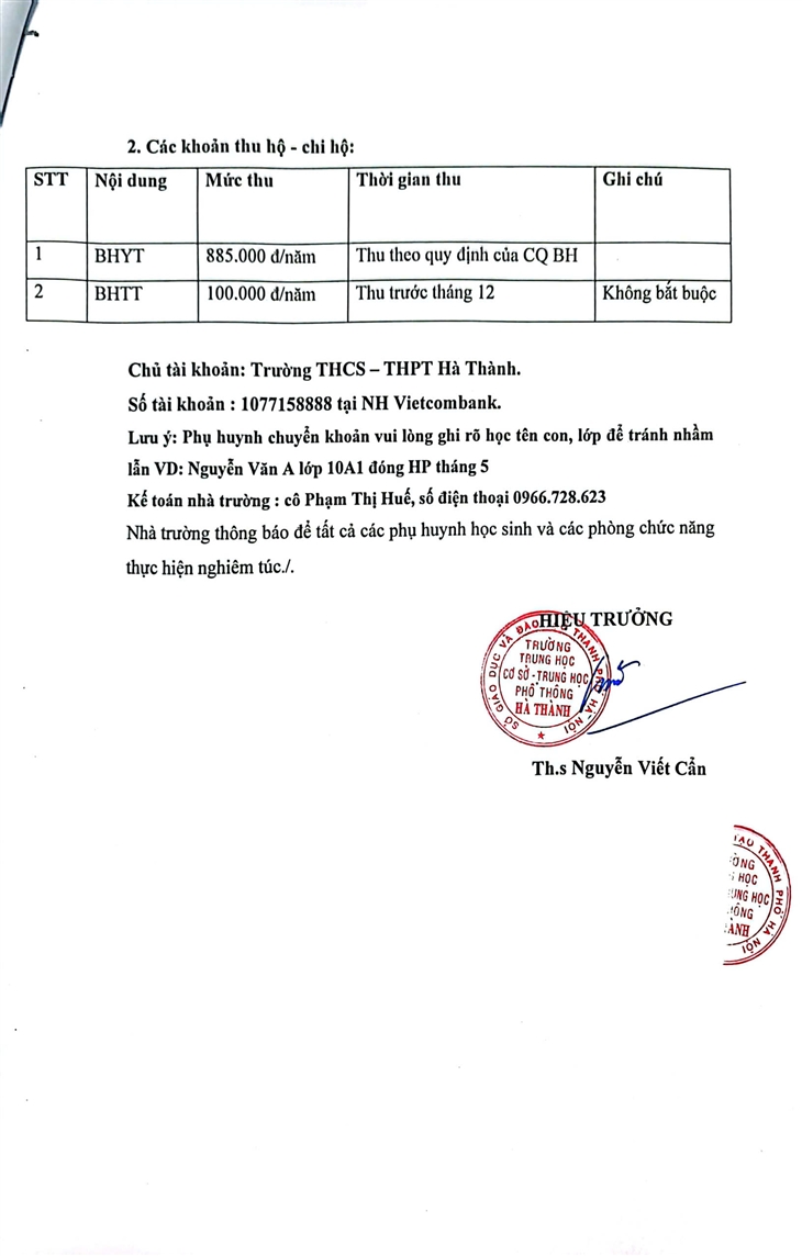 Ø Thông báo về các khoản thu đầu năm các lớp THCS - THPT Hà Thành